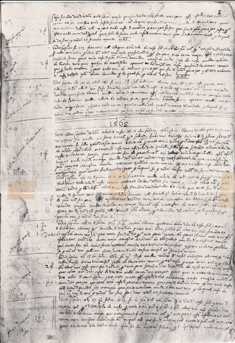 Els capbreus Els capbreus eren documents fiscals en els quals els senyors feudals feien constar el nom de totes les persones obligades a pagar impostos, fos en diners o en espècies —productes o dies de treball a les terres del senyor—. En aquests documents s’hi consignaven també els propietaris de les cases i la seva professió. Creuant aquesta informació amb les dades proporcionades per l’arqueologia, és possible reconstruir l’evolució de bona part de la població en determinats moments històrics. Com a exemple, sabem que la casa situada a l’extrem sud del carrer Major era propietat, l’any 1361, de Guillem Salzeda. L’any 1500 la casa pertanyia a la família Roig, dedicada al comerç, i el 1565 va passar a mans de Feliu Molera, també mercader, que es va casar amb Caterina, hereva de l’anterior propietari, Nicolau Roig. Algunes de les famílies esmentades en aquests capbreus han mantingut la seva presència a Roses fins a l’actualitat. |