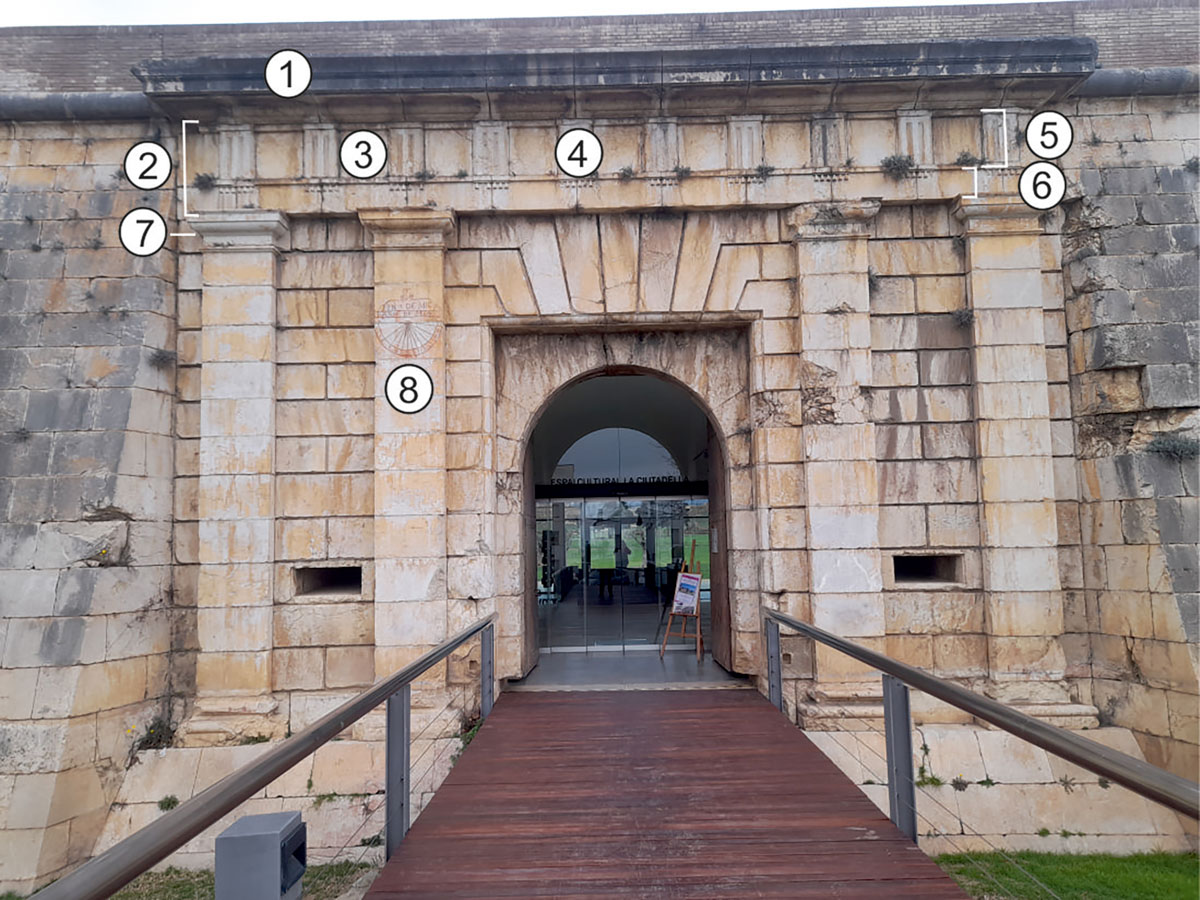 3 Parts de la porta monumental de la Ciutadella. 1 Cornisa; 2 entaulament; 3 Mètopa; 4; Triglif; 5 Fris; 6 Arquitrau; 7 Pseudocapitell; 8 Pilastra.